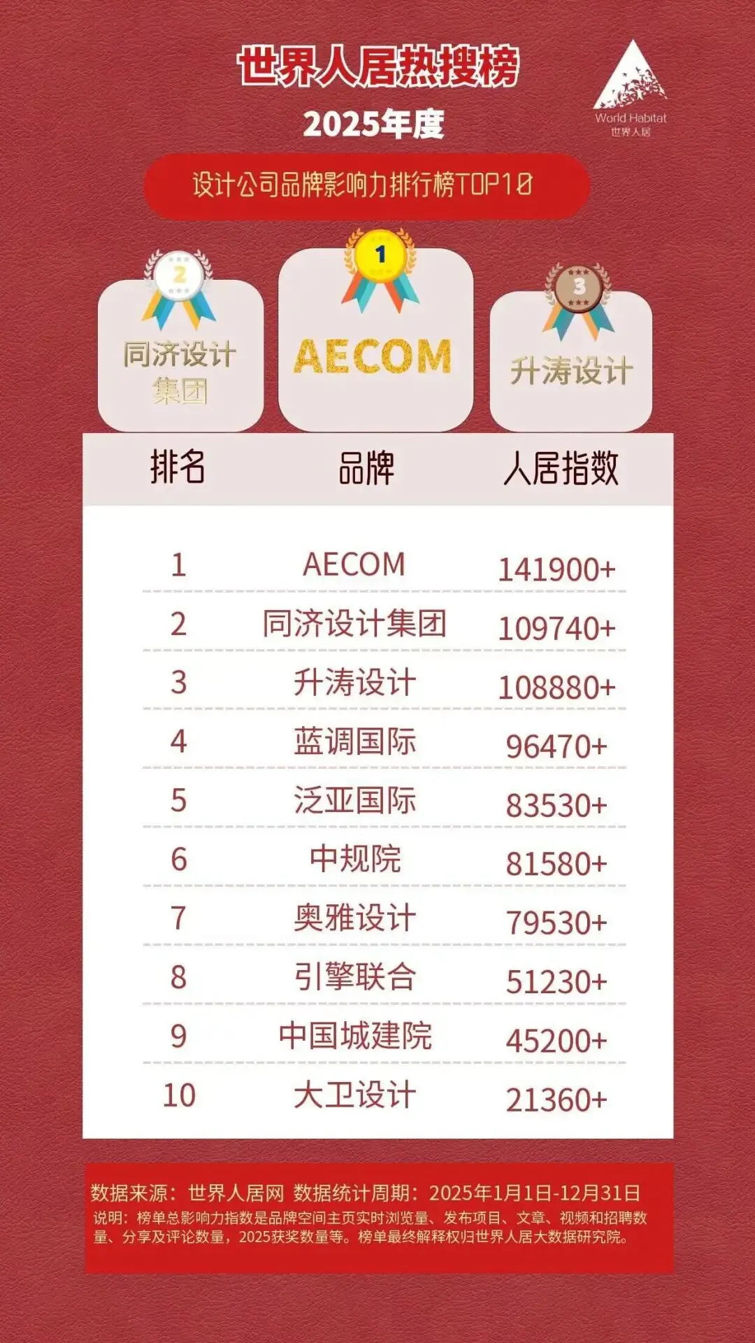 2026年1月31日,全球人居環境領域權威榜單——“2025年世界人居熱搜榜”由世界人居網正式發布。本次評選依托平臺大數據,在瀏覽量、互動度、內容產出、人才活躍度及行業榮譽等十大關鍵維度基礎上,首次將“獲獎數量”納入“人居指數”核心計算體系,全面衡量設計機構的綜合影響力與行業貢獻。榜單不僅反映市場熱度,更成為評估機構專業實力與品牌價值的重要風向標。
