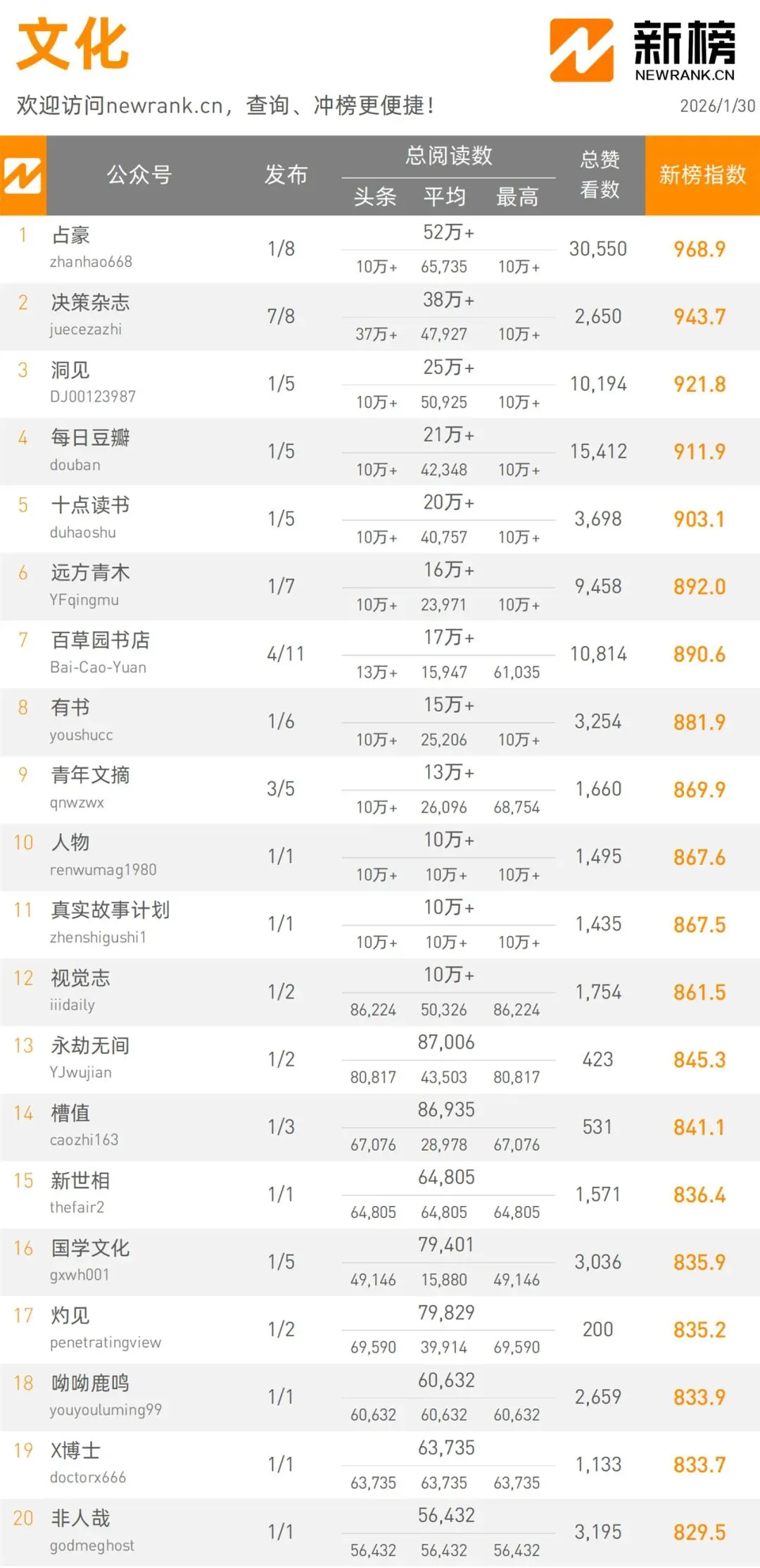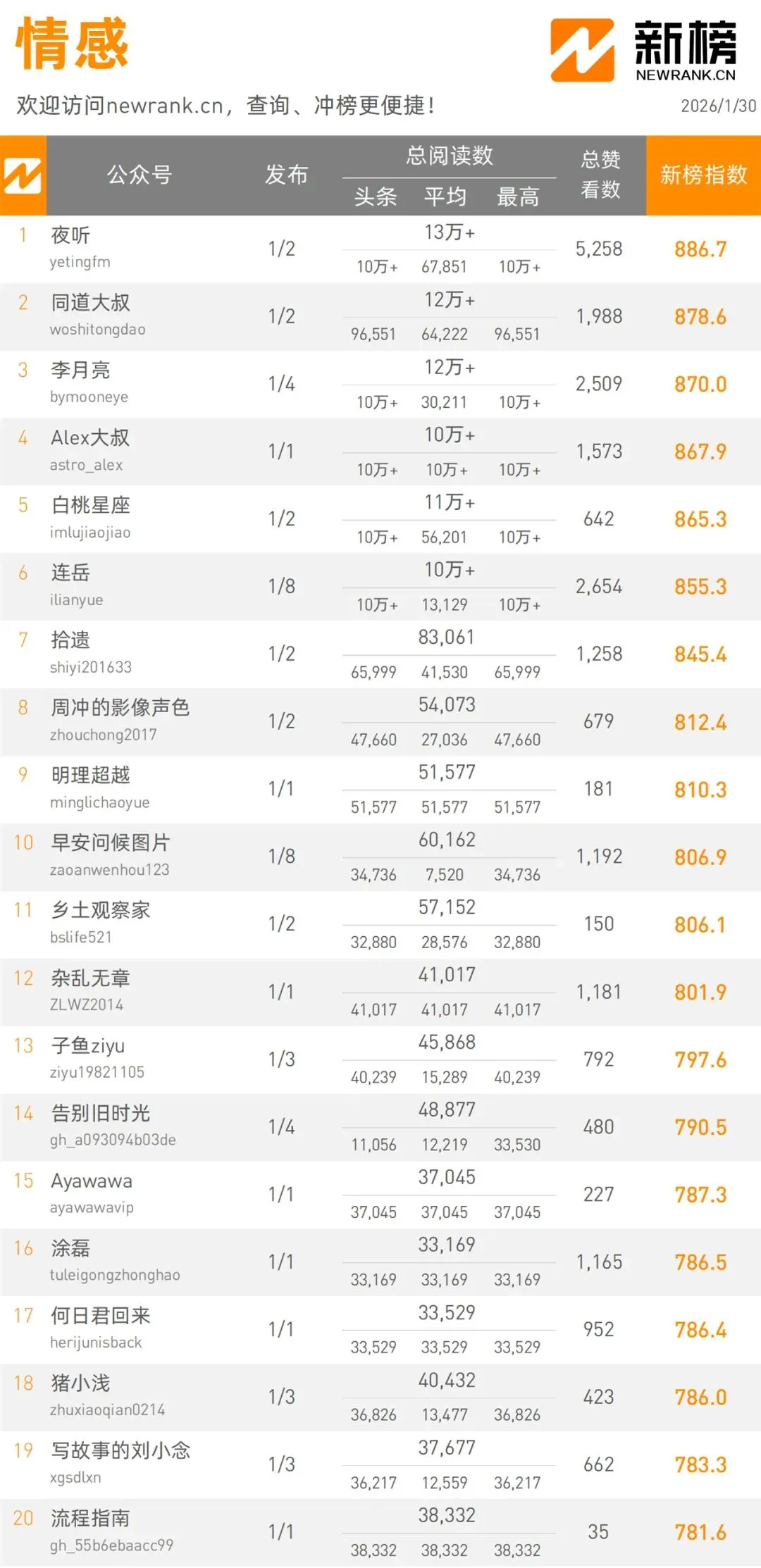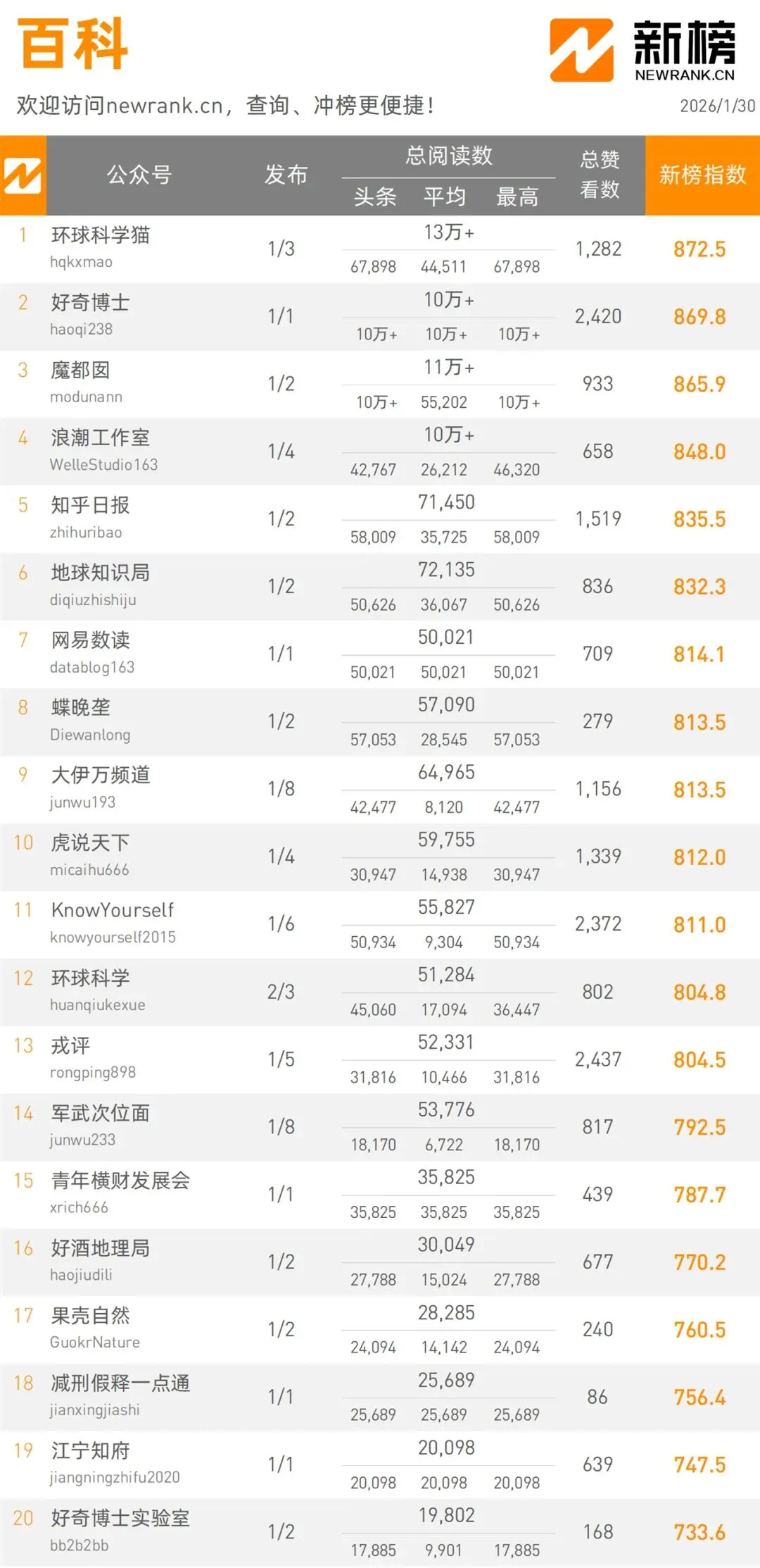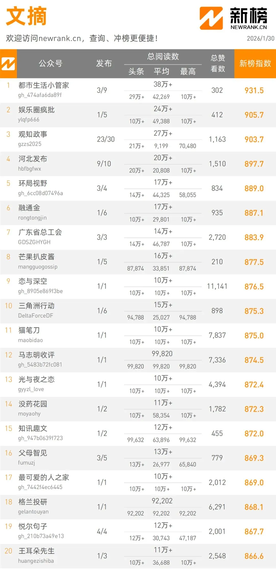當(dāng)前位置:首頁(yè)>排行榜>1月30日微信公眾號(hào)影響力排行榜 | 新榜發(fā)布