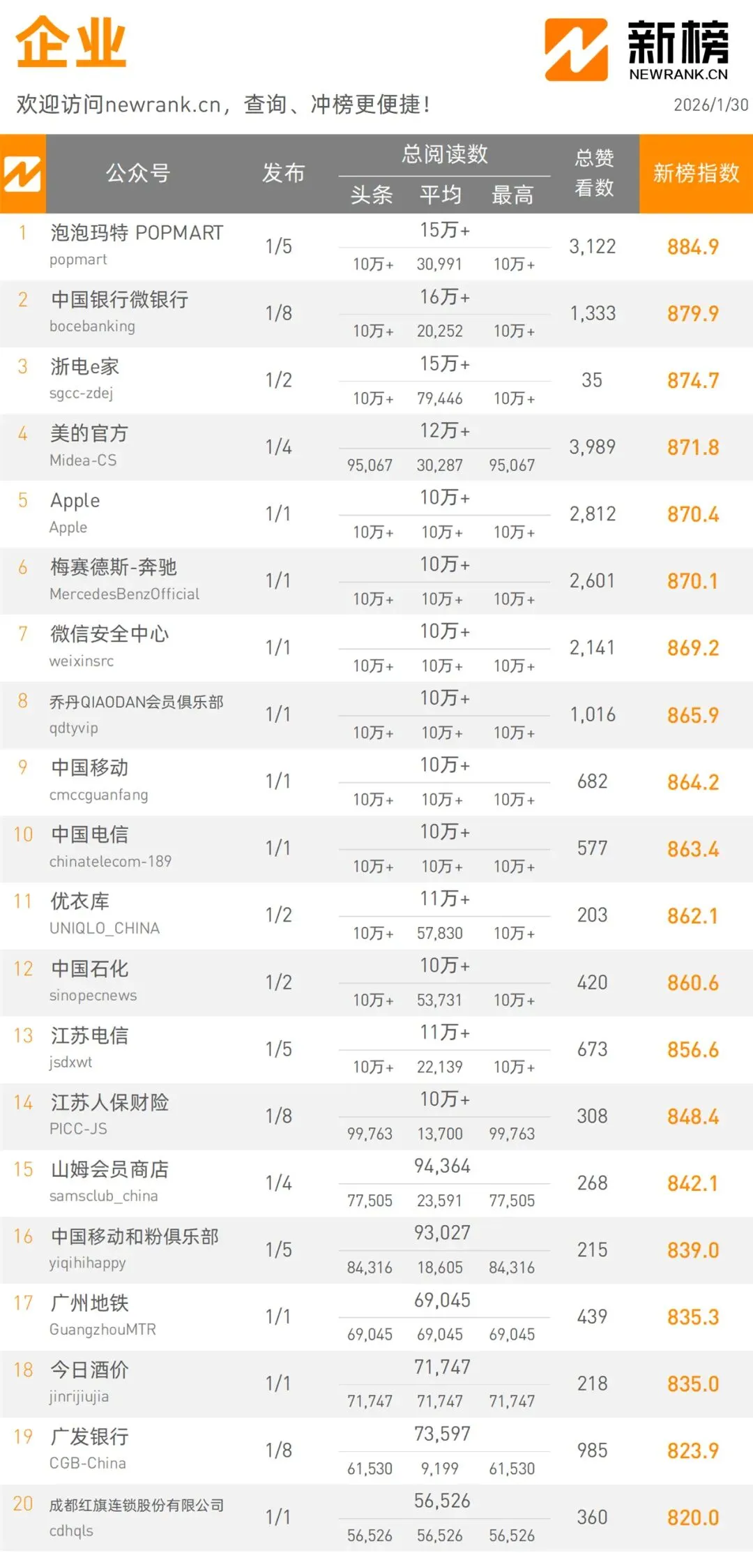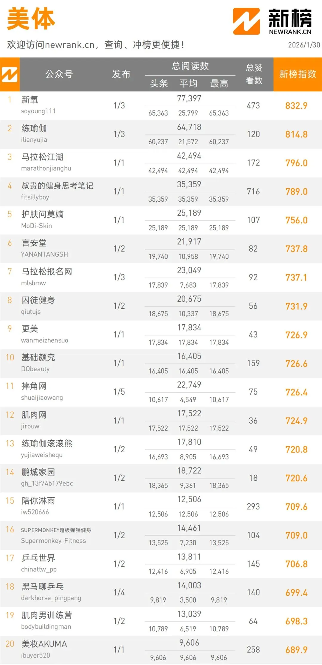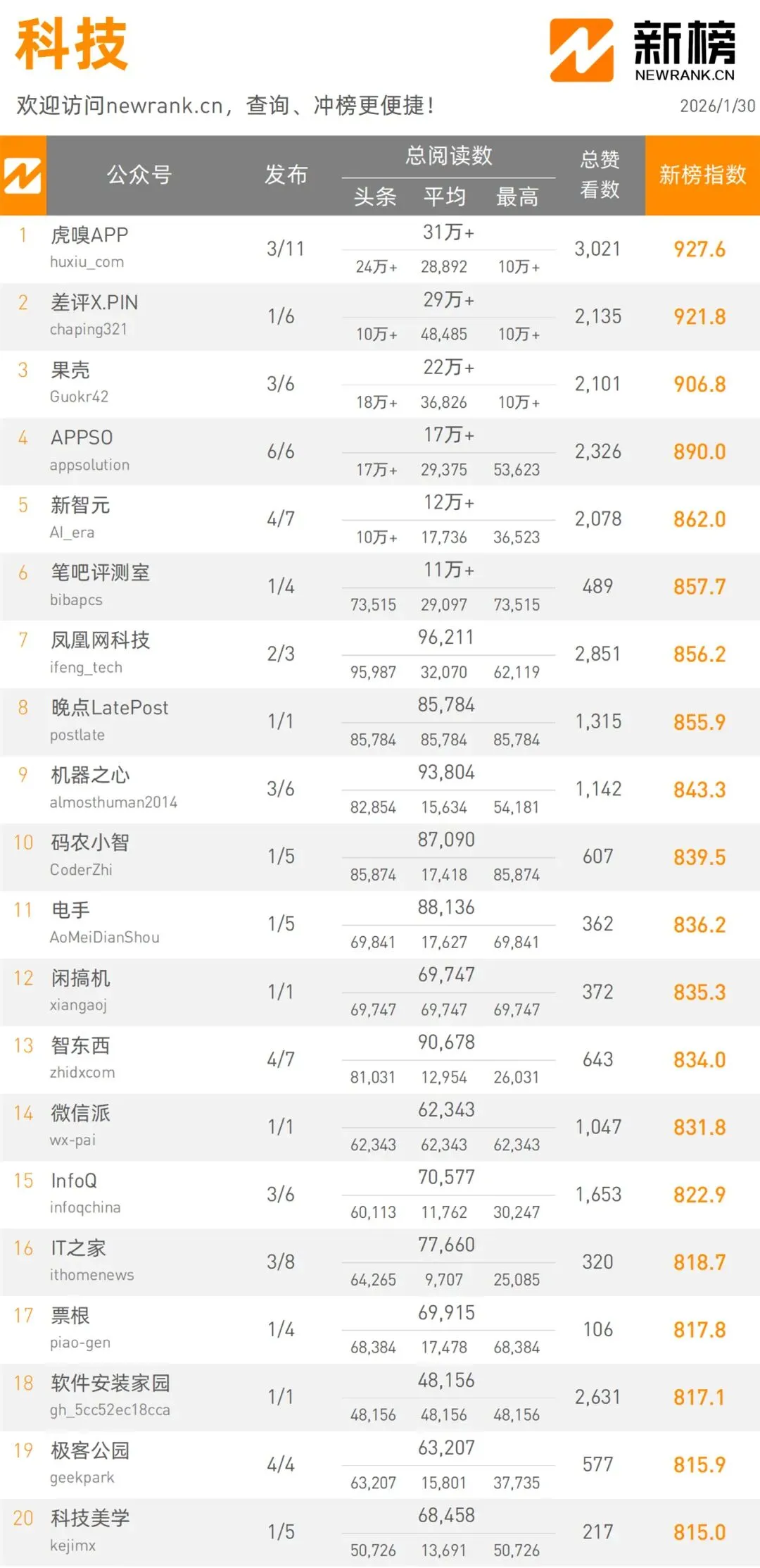當(dāng)前位置:首頁(yè)>排行榜>1月30日微信公眾號(hào)影響力排行榜 | 新榜發(fā)布