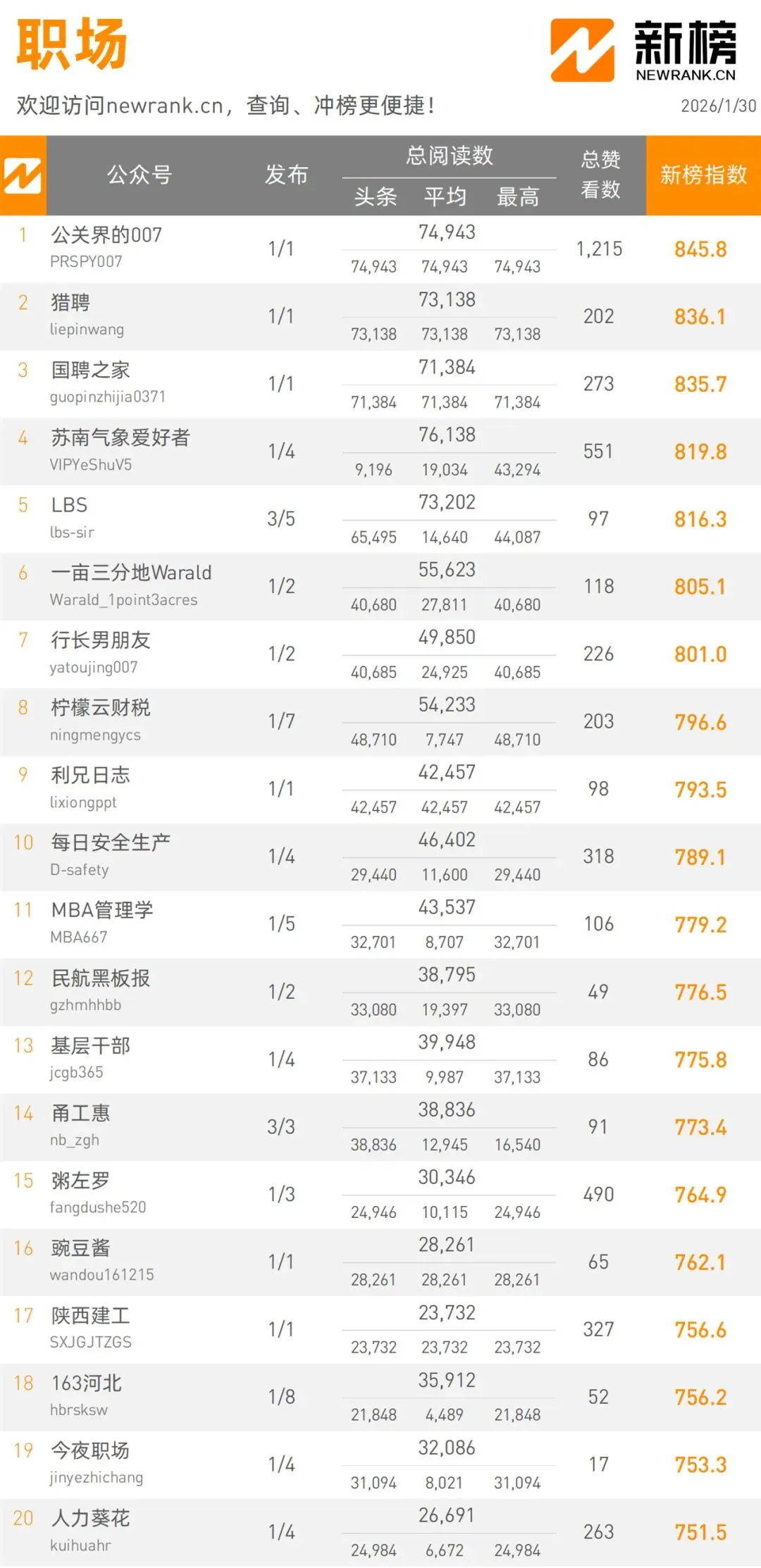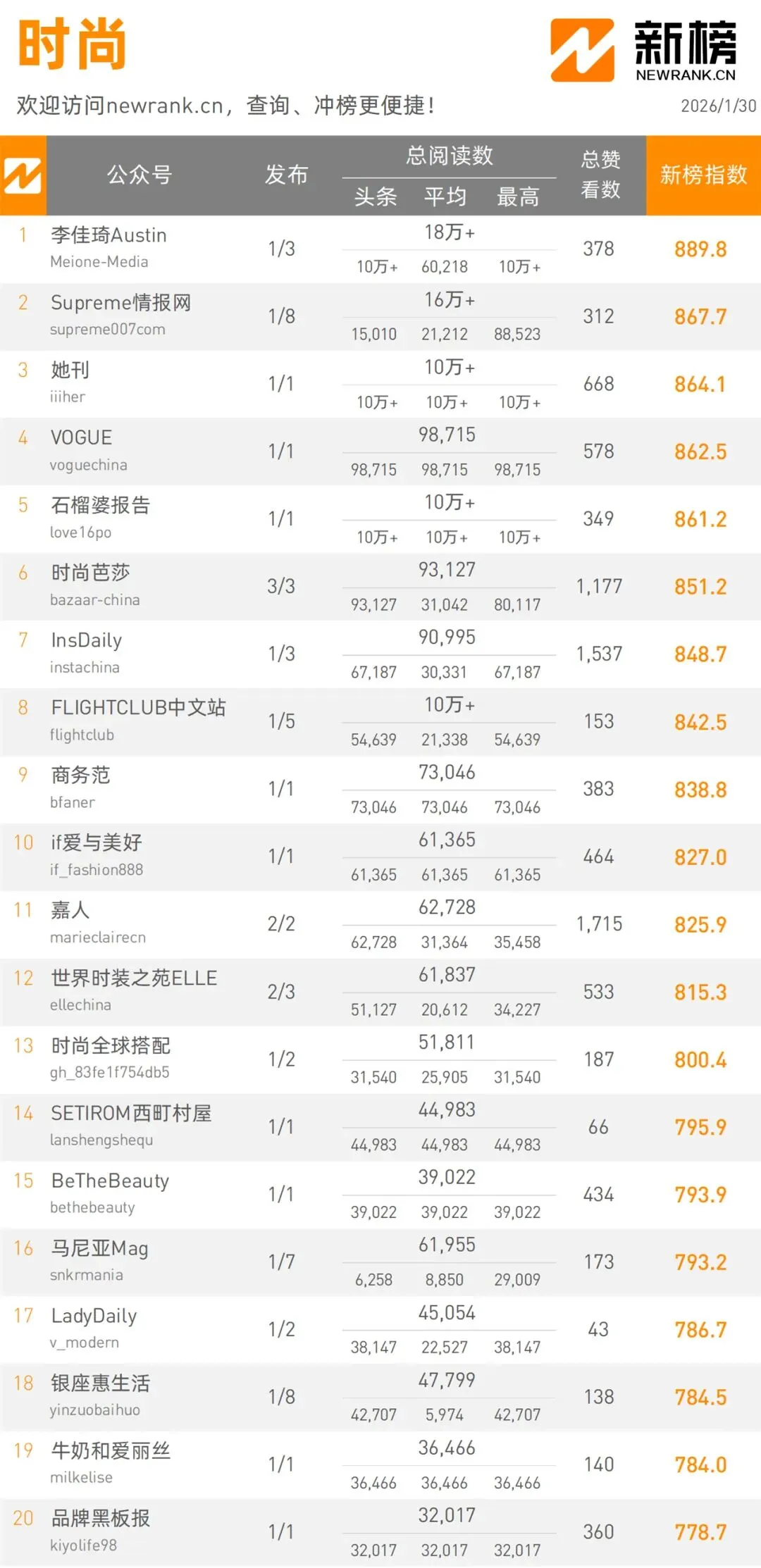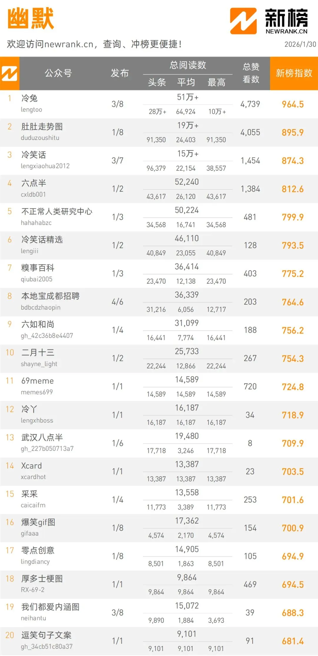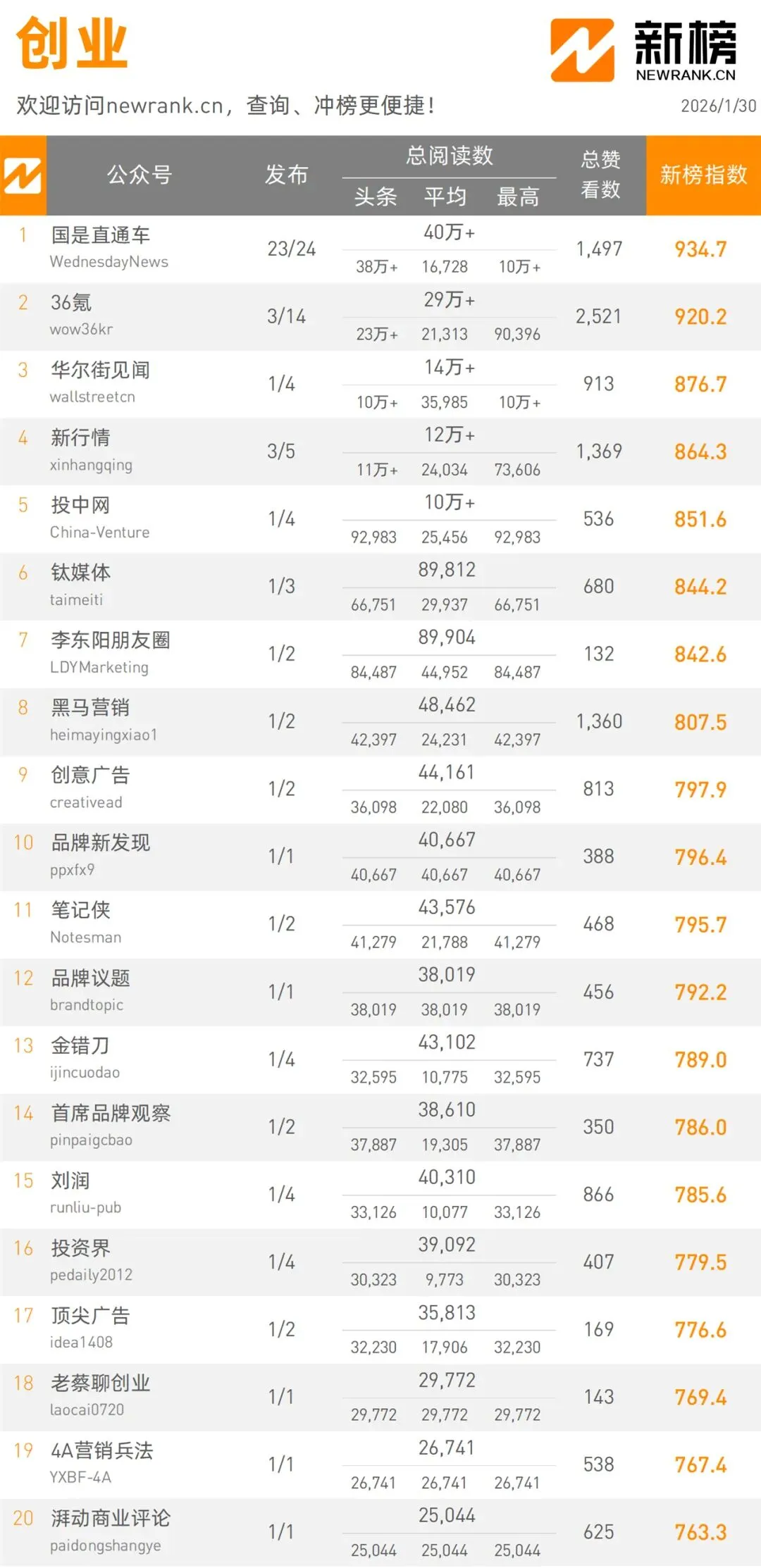 當(dāng)前位置:首頁(yè)>排行榜>1月30日微信公眾號(hào)影響力排行榜 | 新榜發(fā)布
