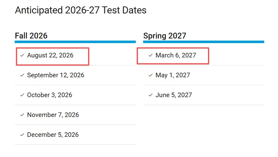 近日,美國大學理事會(College Board)對2026-27學年的SAT考試時間安排進行了兩處微調,涉及8月及3月的考試日期。具體調整如下:
