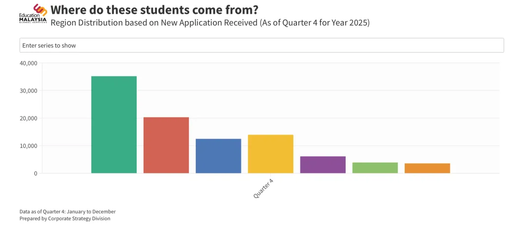 2025年,馬來西亞國際學生新申請總量為95522份,亞洲是最主要的生源地,其中: