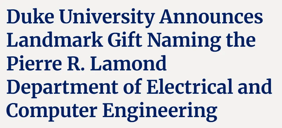 近日,QS世界大學排名第62位的美國杜克大學宣布,其普拉特工程學院下屬的電氣與計算機工程系正式更名為“Pierre R. Lamond 電氣與計算機工程系”。