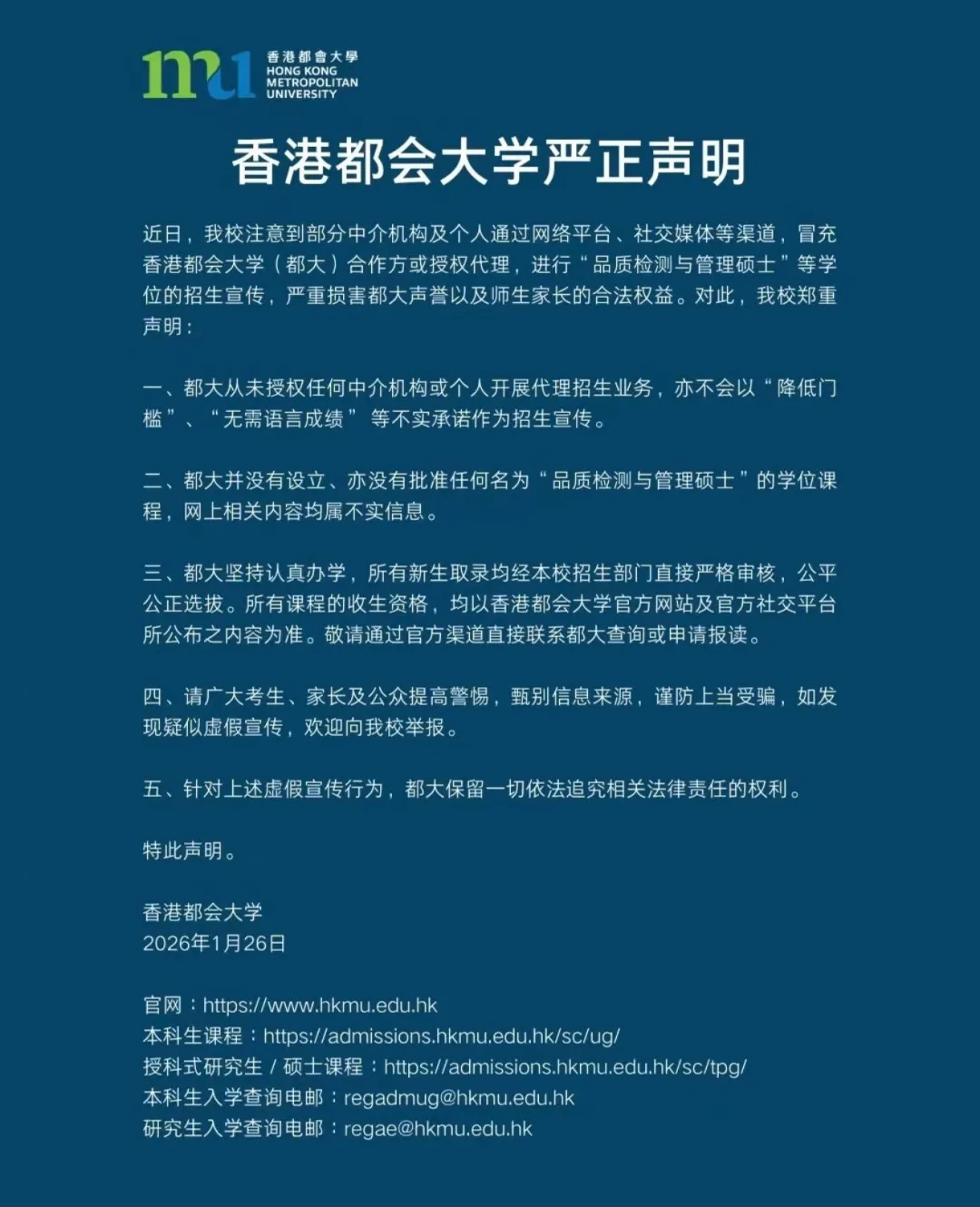 近日,我校注意到部分中介機構及個人通過網絡平臺、社交媒體等渠道,冒充香港都會大學(都大)合作方或授權代理,進行“品質檢測與管理碩士”等學位的招生宣傳,嚴重損害都大聲譽以及師生家長的合法權益。對此,我校鄭重聲明: