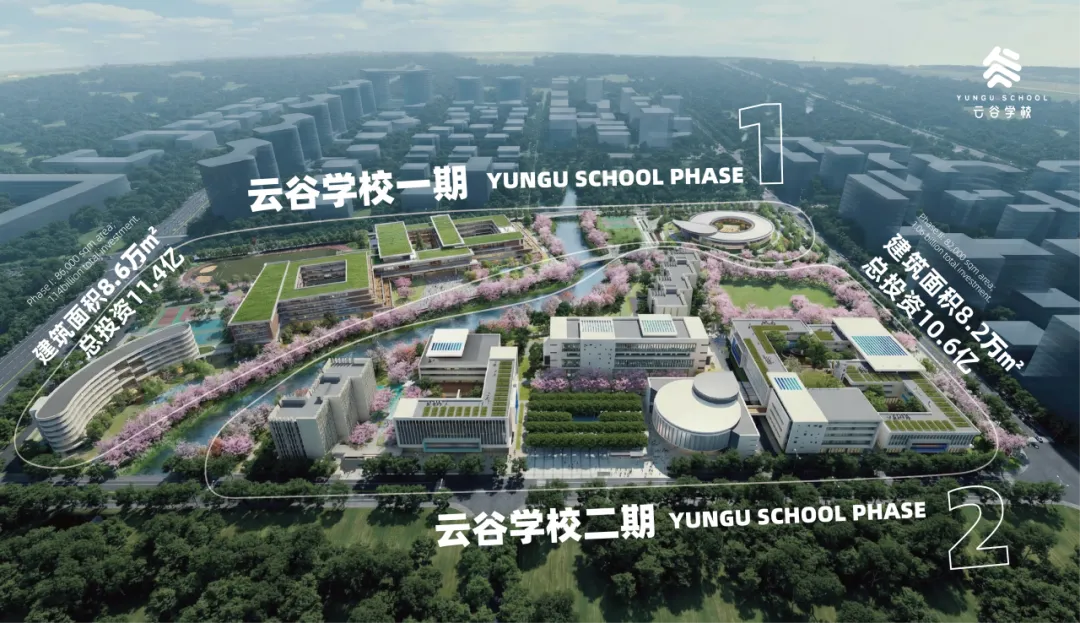 云谷學校總占地面積約14.6萬平方米。一期已于2021年投入使用,建筑面積8.6萬平方米,容納1800名學生。二期建筑面積約8.2萬平方米,預計2028年8月建成,可新增1200個學位。