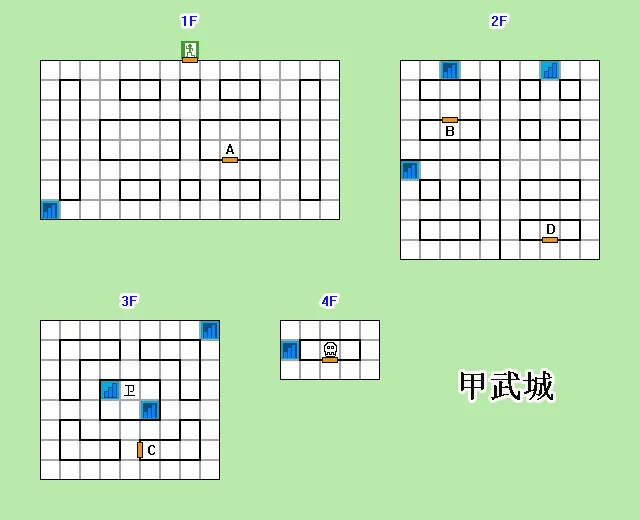 進入2F東南角的房間D,走樓梯去3F中部,打倒士兵,走樓梯去4F;
