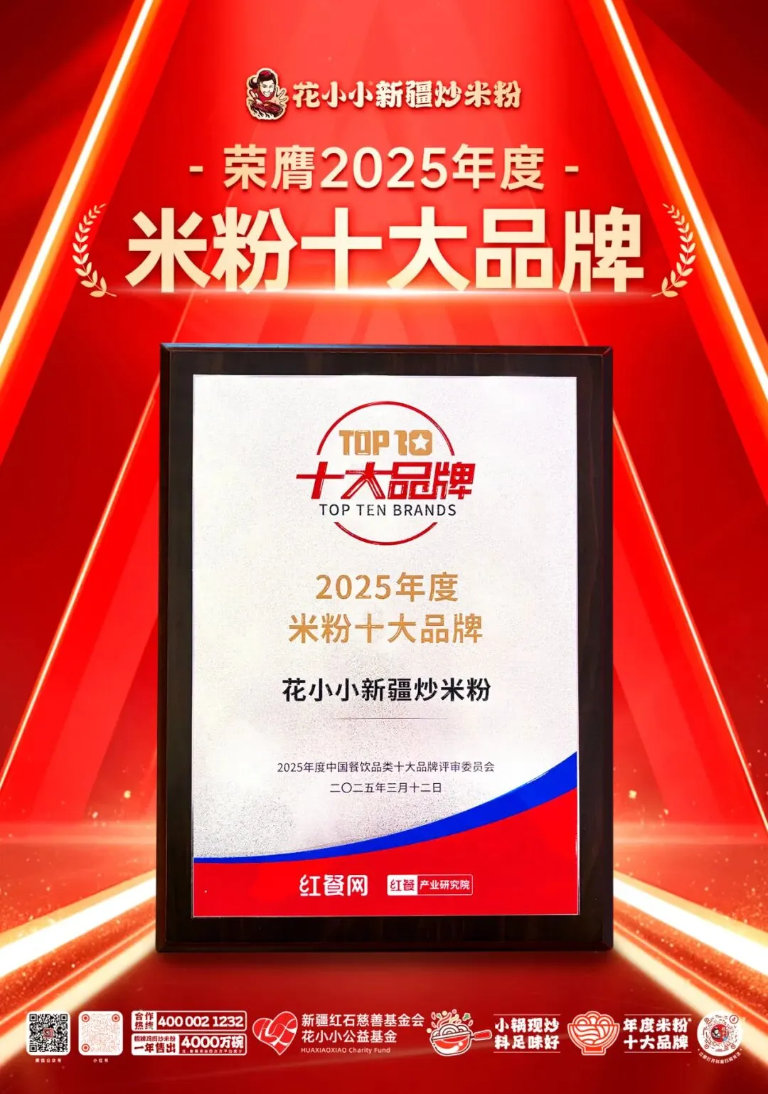 “2025年度中國餐飲品類十大品牌”是國內首份針對“餐飲品類”的權威榜單,評審會以紅餐大數據為基礎,結合全網口碑指數、品牌傳播指數、品牌經營指數和品牌關注度指數四大維度,全面、嚴謹地評估參選品牌的實力,公平公正地在各細分領域綜合表現優秀的餐飲品牌。此次,花小小新疆炒米粉與星巴克、賽百味等行業知名品牌聯合入榜,不僅印證了品牌持續增長的市場競爭力,更彰顯了其作為行業標桿的引領價值。