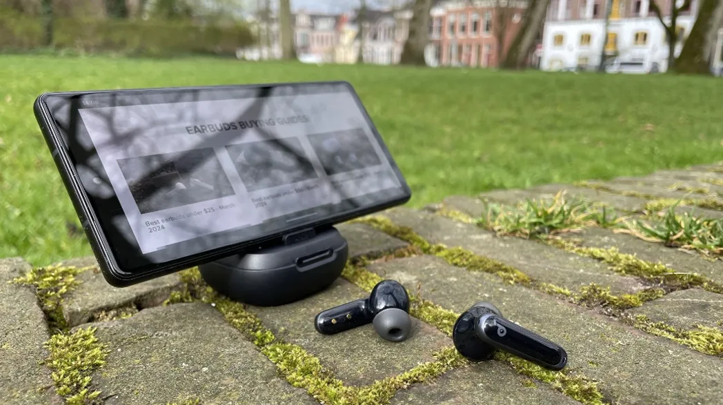 耳機的外觀依舊延續了家族式設計,柄狀入耳結構佩戴穩固,單耳重量輕盈,搭配IPX5防水等級,運動出汗也不影響使用。最有創意的是它的充電盒設計——頂部的小擋板可以抬起變成臨時手機支架,能輕松支撐橫放手機,追劇或視頻通話時非常實用。