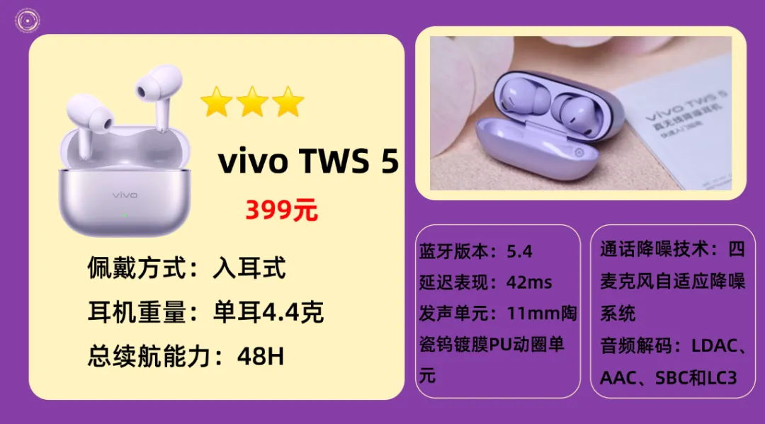 音質方面,vivo TWS 5最大的升級來自達發(AIROHA)藍牙芯片平臺,告別高通方案后帶來了更靈活的編碼支持。標準版支持AAC與LDAC,Hi-Fi版則新增LHDC V5 / LHDC Lossless無損協議,最高碼率可達1.4Mbps。11mm動圈單元調音偏均衡,低頻彈性強,不過稍微有點轟腦,中高頻層次清晰,人聲飽滿自然。藍牙5.4連接穩定,延遲控制不錯。續航方面單次可以使用12小時,搭配充電倉可以使用48小時。