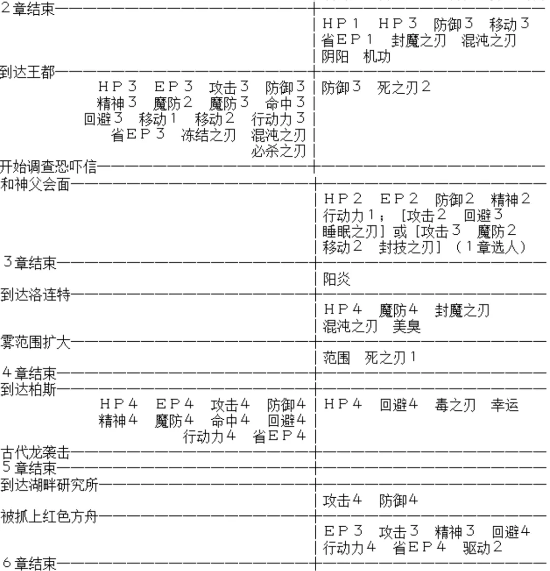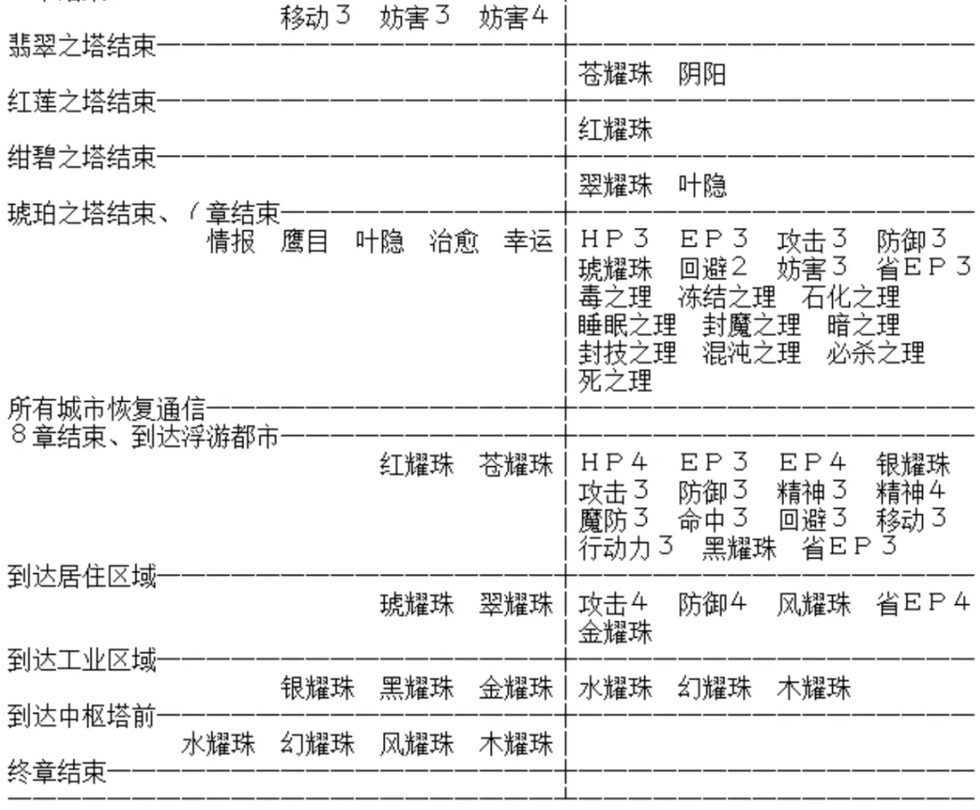 1.SC里的回路從3等變成了5等,意味著回路要更換較多次,較為浪費。而游戲前中期耀晶片比較缺乏,因此建議前期最好盡量少把耀晶片花費在合成XX1、XX2、XX3的回路上面(驅動2還是盡早多準備),而留到第五章合成XX4的回路。五至八章的戰斗相對比較有難度,如果XX4回路較充裕,可以打得比較輕松。此外雖然一開始就可以進行結晶孔的Lv2強化,但是序章至四章很少出現Lv2的回路(XX4及天眼等特殊回路),因此不需要強化太多人的孔。魔法型角色可以多強化一些以提升EP上限。等到第五章,再根據手頭耀晶片的多少進行大規模強化。建議把小艾的孔盡早都強化,第六章有用。后期合成耀珠以及結晶孔的Lv3強化需要消耗大量耀晶片(終章的耀珠每個要花費耀晶片1000左右),因此在七、八兩章一定要有意識的積攢耀晶片。要點如下:(1)前期最好多刷一些天使羊。不過第八章有更快的方法,可以不用這個。(2)第四章結束后的礦山委托書支線任務可以選擇得到某種耀晶片500個。建議選擇空屬性,因為金耀石價格最貴(從換錢的地方可以看出),而且一般最缺的一種就是空屬性。(3)各處的寶箱都撿全。有些寶箱會裝有耀晶片。第七章的各個異空間,從箱子里可以撿到不少耀晶片。(4)平時每場戰斗要盯著紅色的SEPITH ?UP獎勵,如果獎勵輪到我方,盡量用小艾的S技和旋風輪、雪拉的女王之怒、提妲的炮射沖擊、風之領域魔法等打擊數高的招式搶奪較多額外耀晶片。同時盡量避免被敵人搶到SEPITH ?UP獎勵。(5)好好利用SC的釣魚系統(釣魚資料參見空間中另一帖)。第八章善于釣魚可以獲得巨量耀晶片。前五章先弄到幾條黑鮭或鮭魚留著(等到第八章再準備也可以),第八章一開始就南下湖畔釣起湖之主霸王紅鮭(必要時用S/L大法),獲得特級釣師認定證,然后去王都的釣公師團便可以購買所有種類的魚餌(不包括可作餌的魚)。有些種類的魚會吐很多的耀晶片,可參考釣魚資料選擇購買合適的魚餌到特定釣點釣取。(6)王都西街區有個一直掛著SALE牌子的店面(戴爾蒙商會),到了第八章可以進去用米拉購買耀晶片,可以在那里批量補充所需的耀晶片。價格:地水火風時耀晶片3000米拉100個;空耀晶片9000米拉100個;幻耀晶片6000米拉100個。PS:個人覺得購買界面有些不友好:每購買一次鼠標都會自動回到第一項;沒法隨時看到自己已有的耀晶片數量;某種數量超過9999也不會提示,購買時最好隨時返回Item里查看已有數量。注意:購買魚餌和購買耀晶片都需要在全部3個零力場發生器送完之前。如果都送完,那么來到王都就會自動進入劇情,你就沒機會了。最好先留著一個城市的零力場不送,等大釣魚大采購結束以后再送。釣魚時如果專門盯著某種魚釣,可能會使某種耀晶片到達上限9999,這時可以把這種耀晶片先換一部分錢,去購買其他種類的耀晶片。注意各地區的換金率不一樣,盧安、蔡斯、王都、洛連特和柏斯分別是20、22、24、26、28(20是指1耀晶片能換得20米拉(空是60,幻是40)。其余類推)。因此最好去柏斯換錢,損失最小。請在第八章就把所有人的所有孔都開到Lv3,并備齊除了耀珠以外的所有回路,然后再繼續攢耀晶片。終章船上的工房是沒有新的回路的,到那時除了還要開小奧、神父、喬絲特幾人的Lv3孔以外,就可以把所有石頭都用來合成耀珠和留給下一周目了。第八章走之前,可以去戴爾蒙商會把身上所有的米拉都購買耀晶片。不用心疼錢。因為終章船上的換金率是30,正好等于戴爾蒙商會的購買價格。如果到時候有剩余的耀晶片,可以原封不動的換回米拉。需要留給終章的耀晶片數量參考:如果要給隊里4人各備齊一套11個耀珠,需要每種耀珠合成3個(因為可以開寶箱/打怪得到一套),那么需要耀晶片總數量為:地3000水6000火3000風9600時6000空6750幻10650(>9999)。實際上并不用備齊完整的四套,各位可根據自己需要進行準備即可。關于(5)(6)兩條建議如下:得到認定證后來到王都,購買數十個川蟲和鮭魚卵即可。來到王都的碼頭(第三章BOSS戰的地方)最里面的釣魚點(在船頭),用這兩種餌只會釣到兩種魚:虹鱒魚和鮭魚。虹鱒魚專吐七色耀晶片,可以七種耀晶片同樣進度的攢,效果要好于其他吐耀晶片的魚。鮭魚則經常會吐鮭魚卵,因此鮭魚卵很難用完,可以釣很久。把鮭魚都留著,不要在這里釣。然后可以去盧安。去盧安前可再購買數十個海參。在梅威海道那個秘密地點(FC古海圖那里),用鮭魚只會釣上兩種魚:鲯鰍和帝劍魚,鲯鰍會吐水耀晶片,帝劍魚會吐更多水耀晶片,并且魚本身可賣高價2500。而用海參在這里會釣到專吐空耀晶片的太陽魚和吐時耀晶片的黑鯛等。在這里水耀晶片很容易超限,及時去換錢。另外在洛連特艾利茲街道的橋邊用鮭魚卵或蝦米只會釣到黑鮭,專吐時/幻耀晶片,也是個不錯的選擇。把黑鮭拿到王都碼頭則可以釣到很多藥和首飾,算是附贈品。不能做餌的魚隨時賣掉。吐出來的用不著的食材、藥等也都可以賣掉。其他地方釣點沒什么太好的地方,總會混有很爛的魚。(注:以上的文字使用的魚名是打過翻譯補丁后的翻譯,如果你沒打補丁,很多魚的名字會不一樣)終章到了浮游都市以后,沒有釣魚的地方了,也不能買耀晶片了,只能打怪和刷羊掉了。不過終章的怪物帶的石頭還是比較多的。2.SC的工房,按游戲進度依次有:序章·盧·洛克爾訓練場宿舍·盧·洛克爾工房第1章·盧安市·北街區·格拉納特工房第2章·