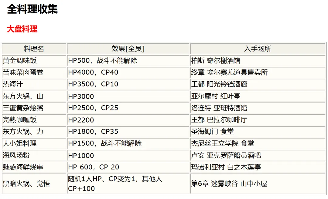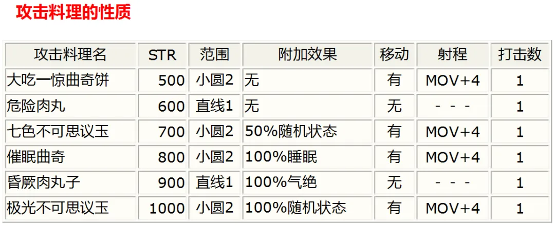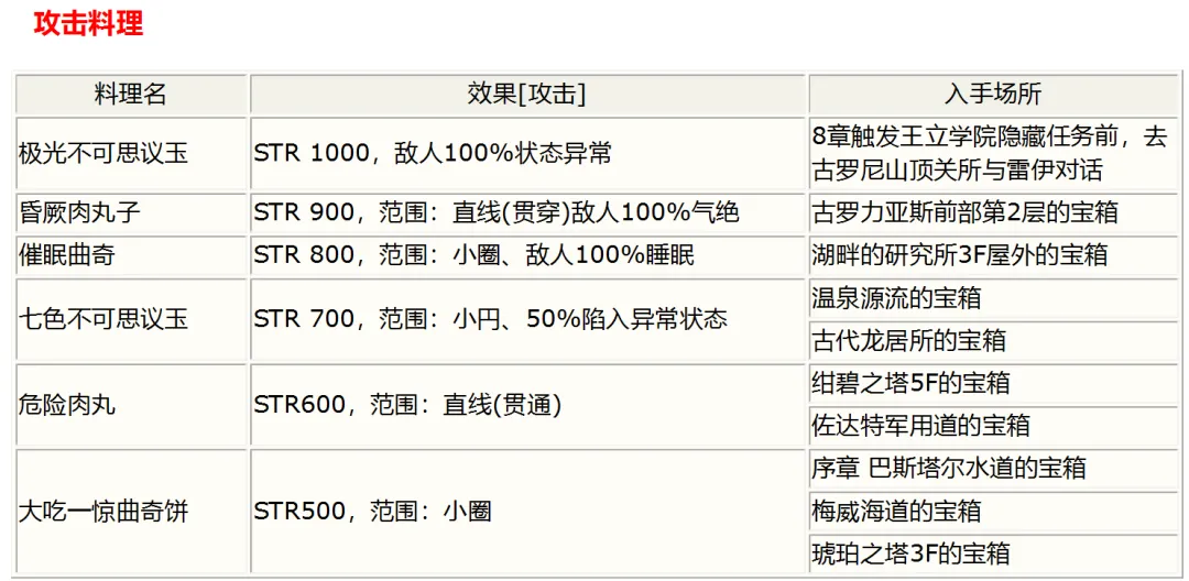各攻擊料理入手時間地點:大吃一驚曲奇餅:序章巴斯塔爾水道的寶箱;第1章梅威海道的寶箱;第5章琥珀之塔3F的寶箱。危險肉丸:第1章紺碧之塔5F的寶箱;第2章佐達特軍用道的寶箱。七色不可思議玉:第2章末溫泉源流的寶箱;第5章末古代龍居所的寶箱。催眠曲奇:第6章湖畔研究所3F屋外的寶箱。昏厥肉丸子:第6章紅色方舟前部第2層的寶箱。極光不可思議玉:第8章古羅尼山頂關所跟NPC雷伊對話(須在送出兩個零力場之前)。PS:SC中還有六種正常無法得到、只能修改出來的料理。其中多數的STR都高得可怕??煽醋魇呛汀拔锢?魔法反射”一類的作弊物品。像最后一種STR5000的,打普通小怪傷害在13000-16000,包括天使羊、小BOSS等在內統統瞬秒,血高防高的BOSS也扛不住幾下。不過其中兩種射程很近,甚至可能低于MOV值。 |