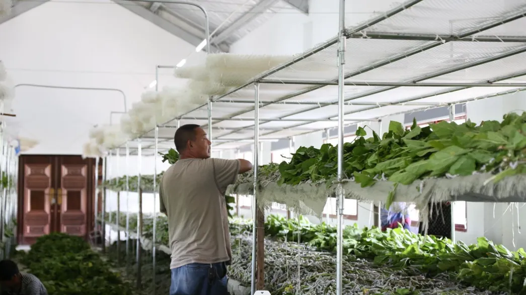 荷葉村天之力桑蠶專業(yè)合作社負責(zé)人陳啟俊正在加工廠里忙碌,煮繭、繅絲、晾干、拉絲網(wǎng)……一系列嫻熟的工藝之后,一床床貨真價實的蠶絲被加工而成,“今年的蠶繭收購已經(jīng)全部完成,前期加工了400多床被子全部銷售一空,今年總共可以生產(chǎn)500多床。”陳啟俊高興地說,這兩年合作社生產(chǎn)的蠶絲被不愁銷路。陳啟俊是村里的資深蠶農(nóng),養(yǎng)蠶30多年,見證了當(dāng)?shù)厣PQ產(chǎn)業(yè)的“生生不息”,在鎮(zhèn)里的扶持下,重拾產(chǎn)業(yè)發(fā)展的信心。在合作社的帶動下,如今村里247戶村民,有102戶從事桑蠶養(yǎng)殖。
