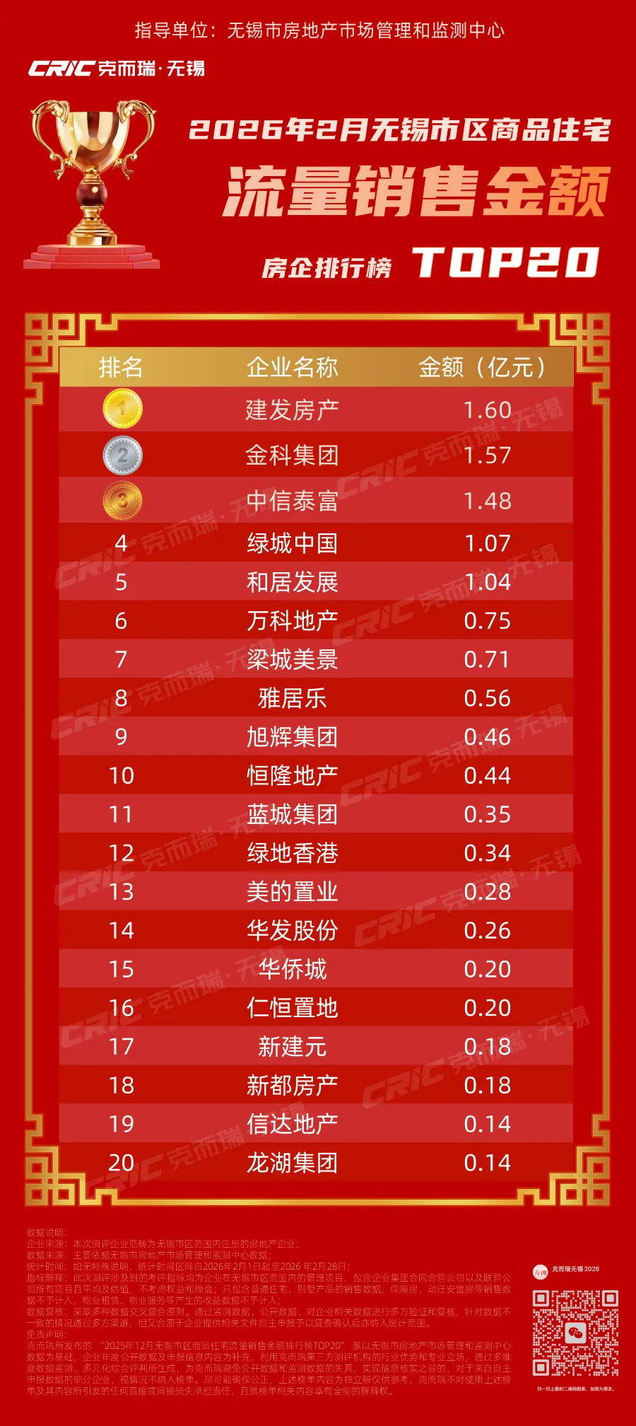 本榜單統計范圍為無錫市區,統計品類為商品住宅,統計周期為2026年2月1日-2月28日,覆蓋全口徑企業金額榜、權益企業金額榜、流量企業金額榜及項目金額榜四大維度。