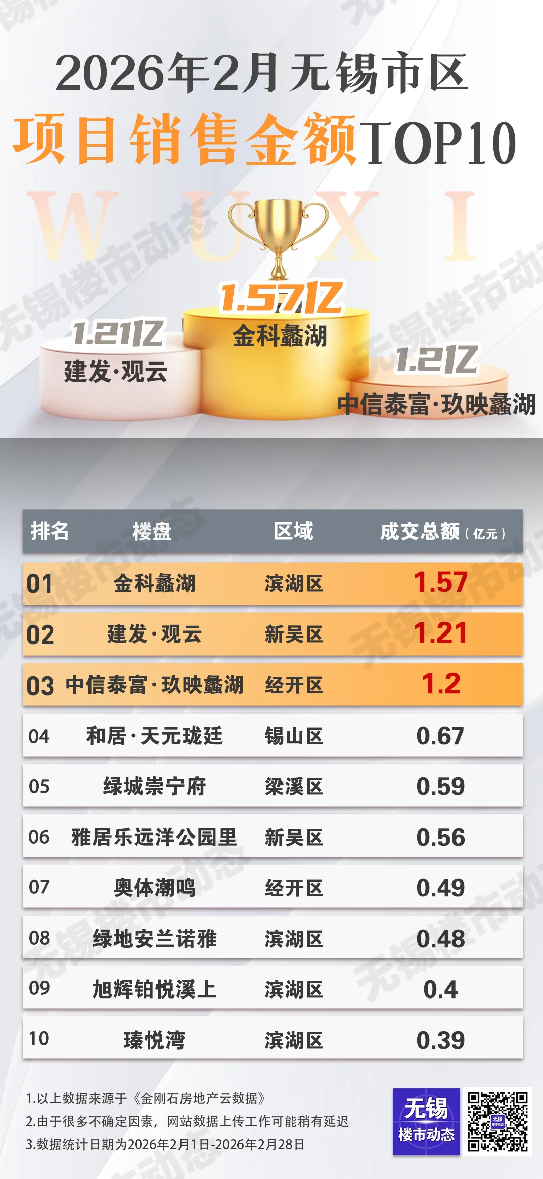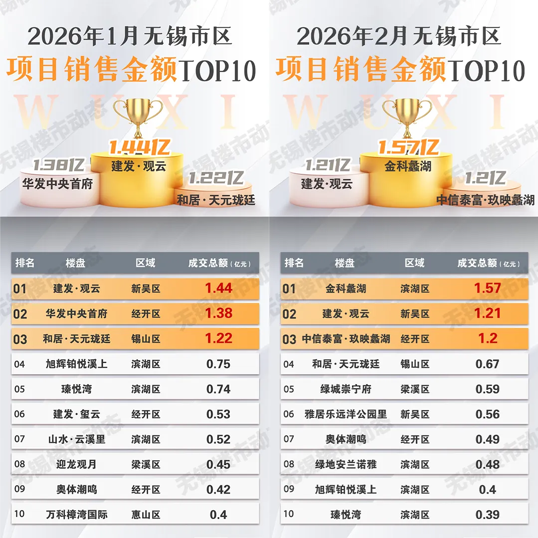 2月的無錫樓市,雖然遭遇春節假期的“淡季效應”,但真正的實力選手從來不會缺席。剛剛,2026年2月無錫市區項目銷售金額排行榜正式公布!2026年2月無錫市區項目銷售金額排行榜TOP5:從這個月的榜單里,我們能讀出一些有意思的信息。