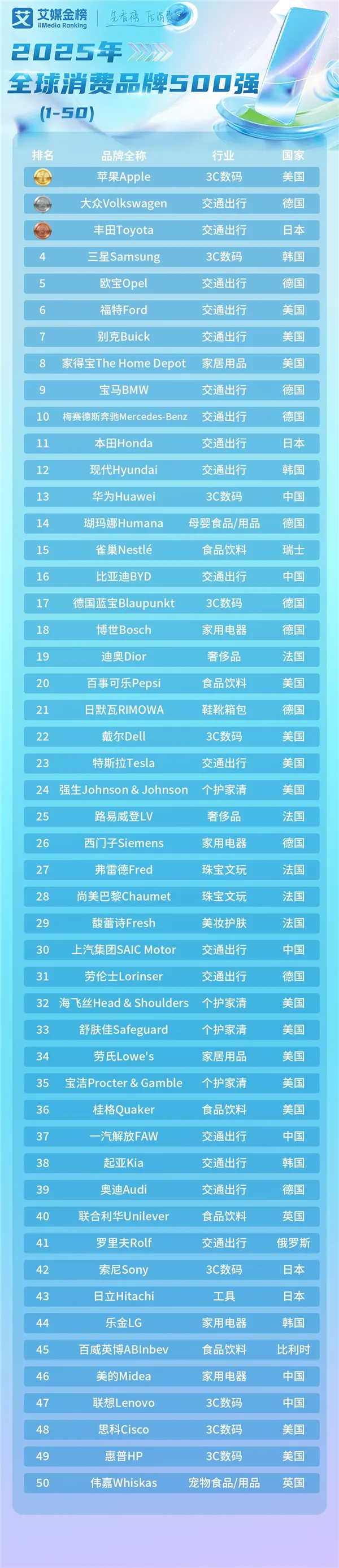 艾媒咨詢發布《2025年全球消費品牌500強》榜單,其中,蘋果位居榜首。