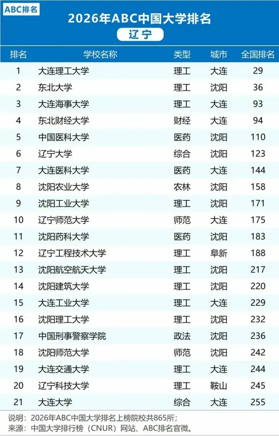 近日,一份最新的大學評估榜單引起社會關注,2026年ABC中國大學排名最新數據,遼寧省內主要高校最新實力位次,該榜單共涉及全國865所本科院校,遼寧省有21所高校上榜,遼寧省內高校排名情況,大連理工大學全國排名第29位,穩居省內第一,東北大學排名全國第36位,省內第二,遼寧大學排名全國第123位,省內第六,這些具體的排名數字,為我們審視遼寧省高等教育的全貌和內部競爭態勢,提供了一個客觀的量化參照。